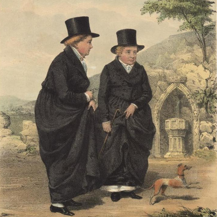 Irish aristocrat and celebrity lesbian Eleanor Butler, best known as one of the Ladies of Llangollen, was BOTD in 1739. Born in Cambrai, France to an aristocratic Irish family, she was educated in a convent before returning to her family’s estate in Kilkenny. In 1768, aged 29, she formed an intimate friendship with her 13 year-old neighbour Sarah Ponsonby, to the mutual consternation of their families. In 1777, Butler’s family despairing that she was too masculine and “satirical” to attract a husband, proposed to send her back to the convent in Combrai. She and Ponsonby hatched a plan to disguise themselves as men and run away to England to find a cottage where they might live together. Their first attempt was intercepted by their families, who returned them home as virtual prisoners. Undaunted, Butler escaped and joined Ponsonby at her home, wearing their families down until they were permitted to leave together. Accompanied by Ponsonby’s maid Mary Carryll, they toured north Wales, finally settling at Plas Newydd, a rented cottage on the outskirts of the village of Llangollen. They lived there for the next 50 years, making improvements to the house in the Gothic style, dressing in black riding habits and men’s top hats when in public and keeping a series of pet dogs named Sappho. Christened the “Ladies of Llangollen,”, they became unlikely celebrities, receiving visits from the Duke of Wellington, William Wordsworth, Percy Shelley, Lord Byron, Sir Walter Scott, Anna Seward, Josiah Wedgwood and Lady Caroline Lamb. Landowning lesbian Anne Lister travelled from Yorkshire to visit them, and was sufficiently inspired to informally marry her girlfriend. Queen Charlotte became a regular correspondent, eventually persuading King George III to grant them a pension, and the French king Louis XVI awarded Butler the Crois St Louis. In 1791, a magazine speculated that Butler and Ponsonby were in a sexual relationship, offending them to the point of taking legal advice about suing for libel. They lived together until Butler’s death in 1829, aged 90. Ponsonby died two years later, and they were buried together, with Carryll, at St Collen’s Church in Llangollen. Biographers continue to debate whether they had a sexual relationship, or were, as their friend Prince Pückler-Muskau described, “the most celebrated Virgins in Europe”. Now considered lesbian and queer icons, their relationship has inspired writings by Wordsworth, Sewell, Colette, Mary Gordon and Emma Donoghue.